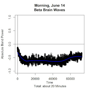 I post today's figures only because I note a different brain wave pattern than usual. Towards the end of my meditation, when I was in a state of quite powerful focus and interior energy, together with a near empty mind, the EEG shows a spike in Beta/Gamma waves. I understand how difficult it is to draw any firm conclusions from these results; however, it is a pattern worth noting.